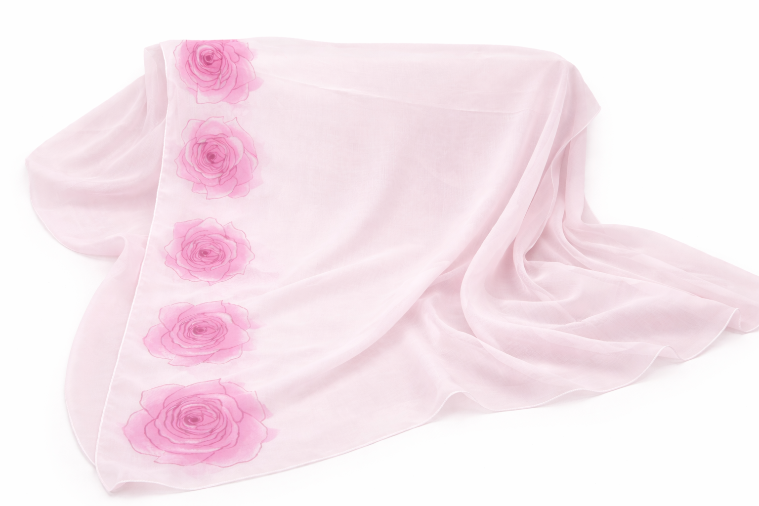 This exclusive chiffon shayla features delicate hand-painted rose artwork flowing beautifully along one entire side, creating a graceful and eye-catching statement. Designed as a wearable canvas, each rose is carefully painted by hand, giving the piece depth, softness, and refined charm.