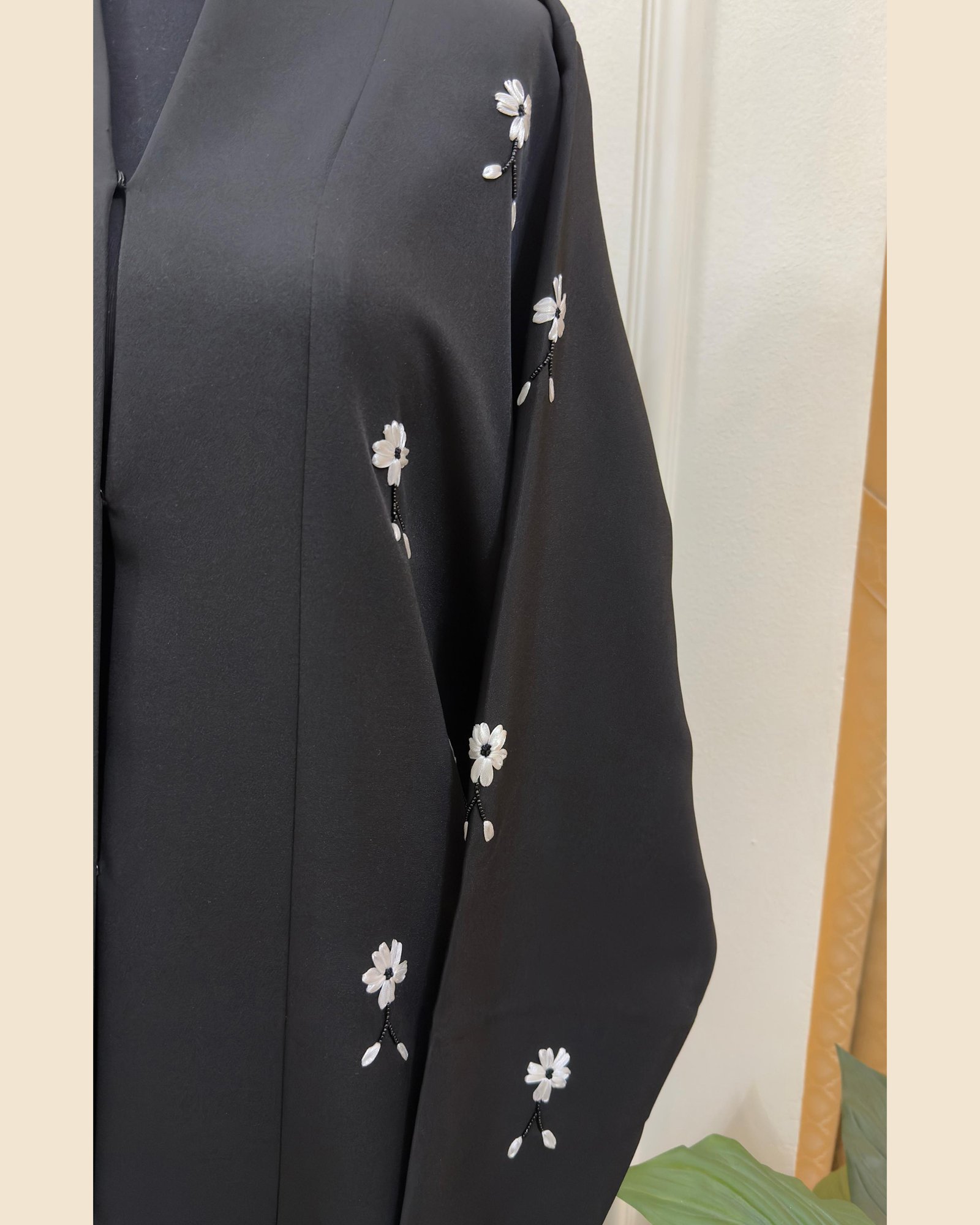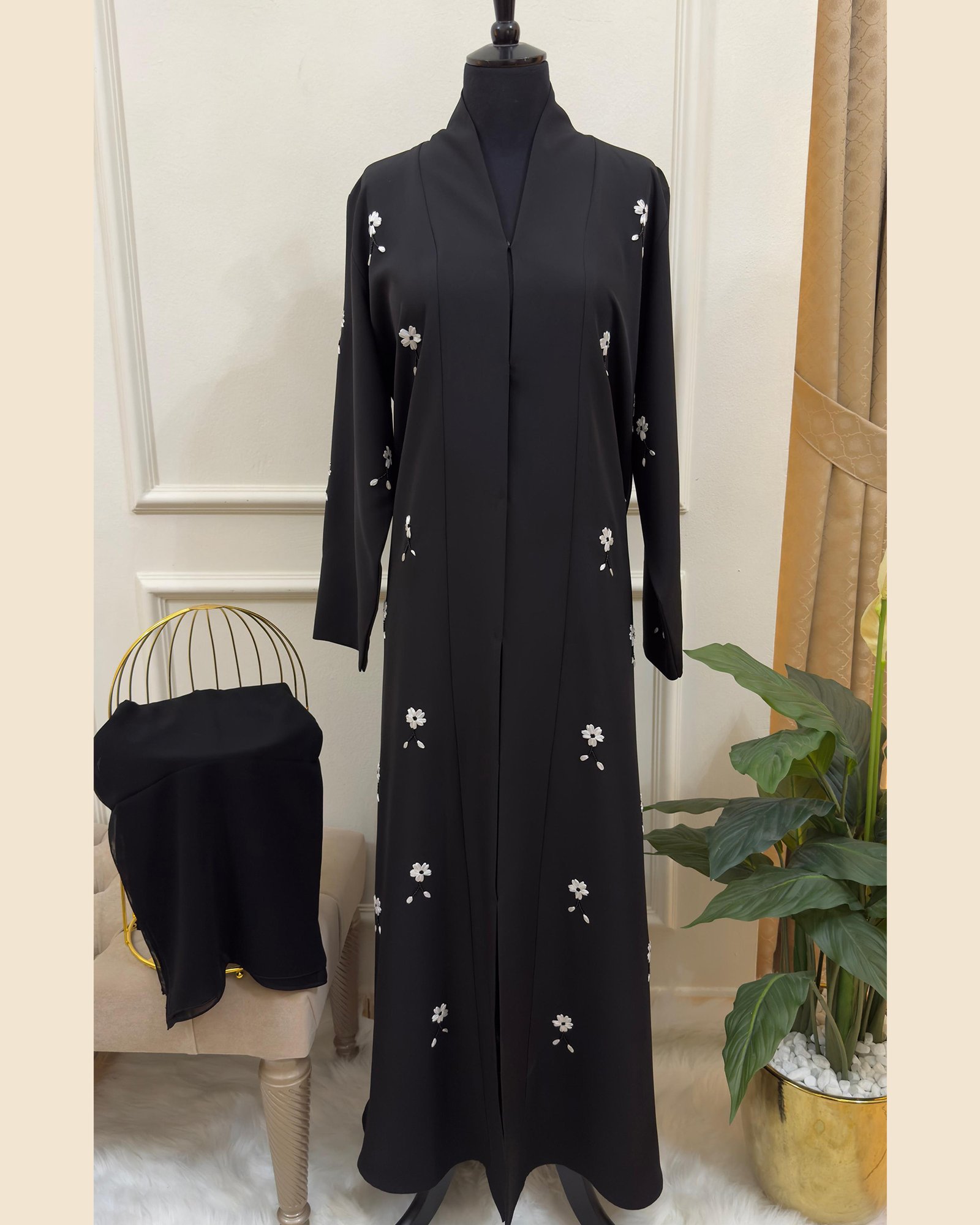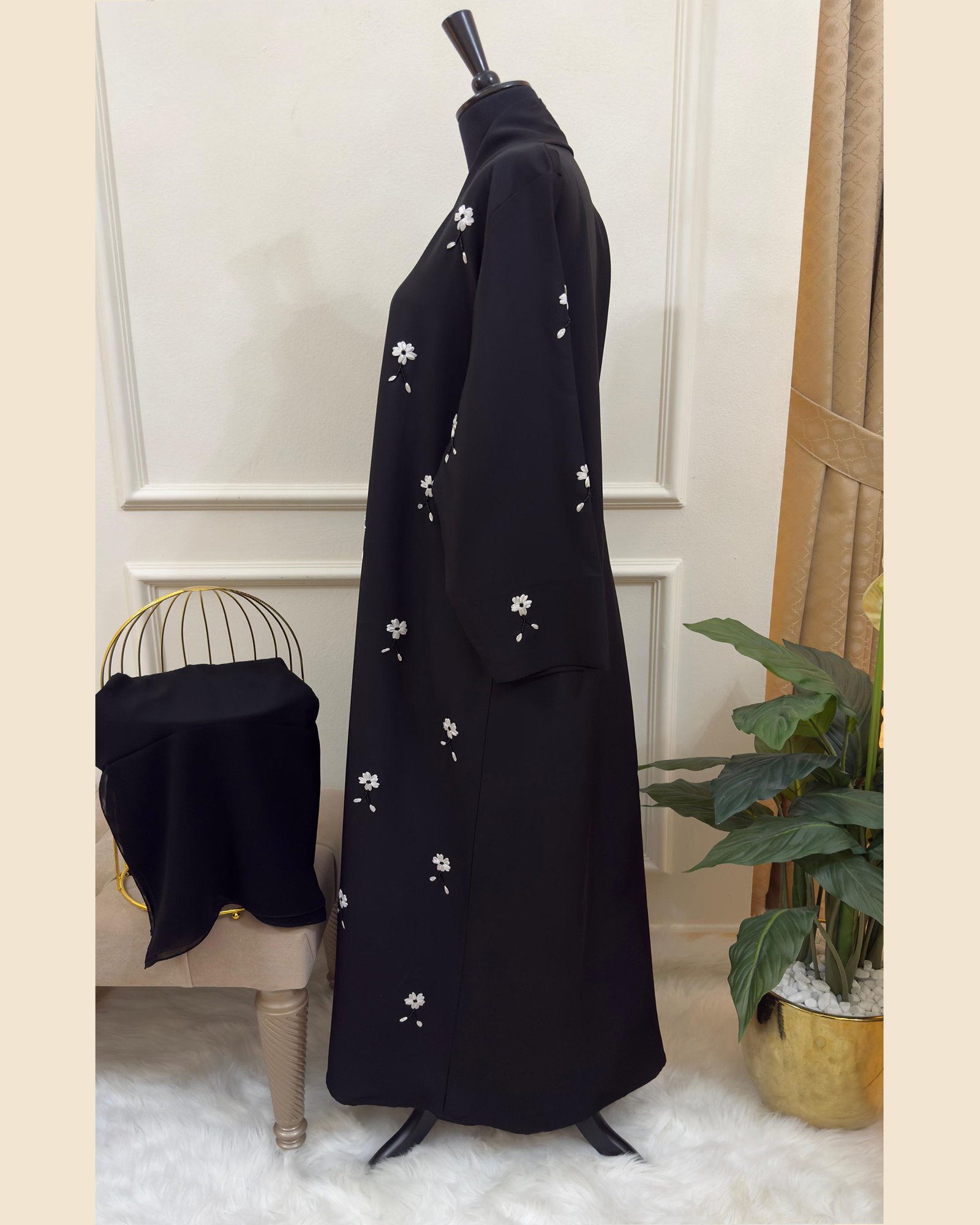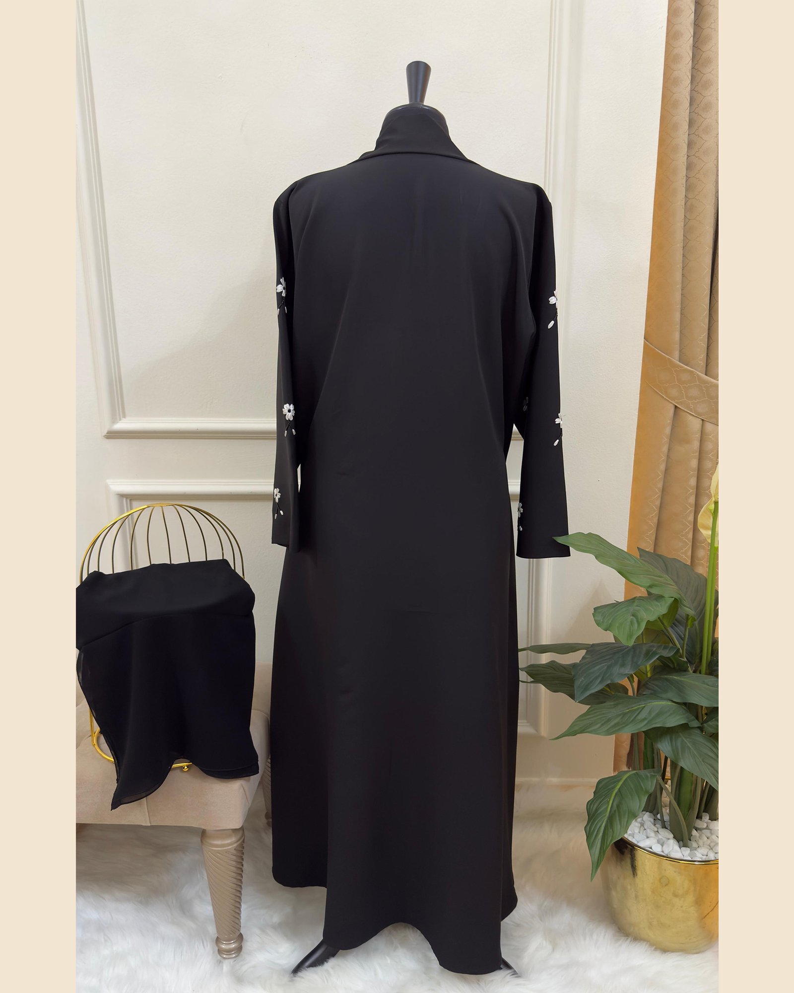 A sophisticated black Abaya Set that blends simplicity with delicate craftsmanship —