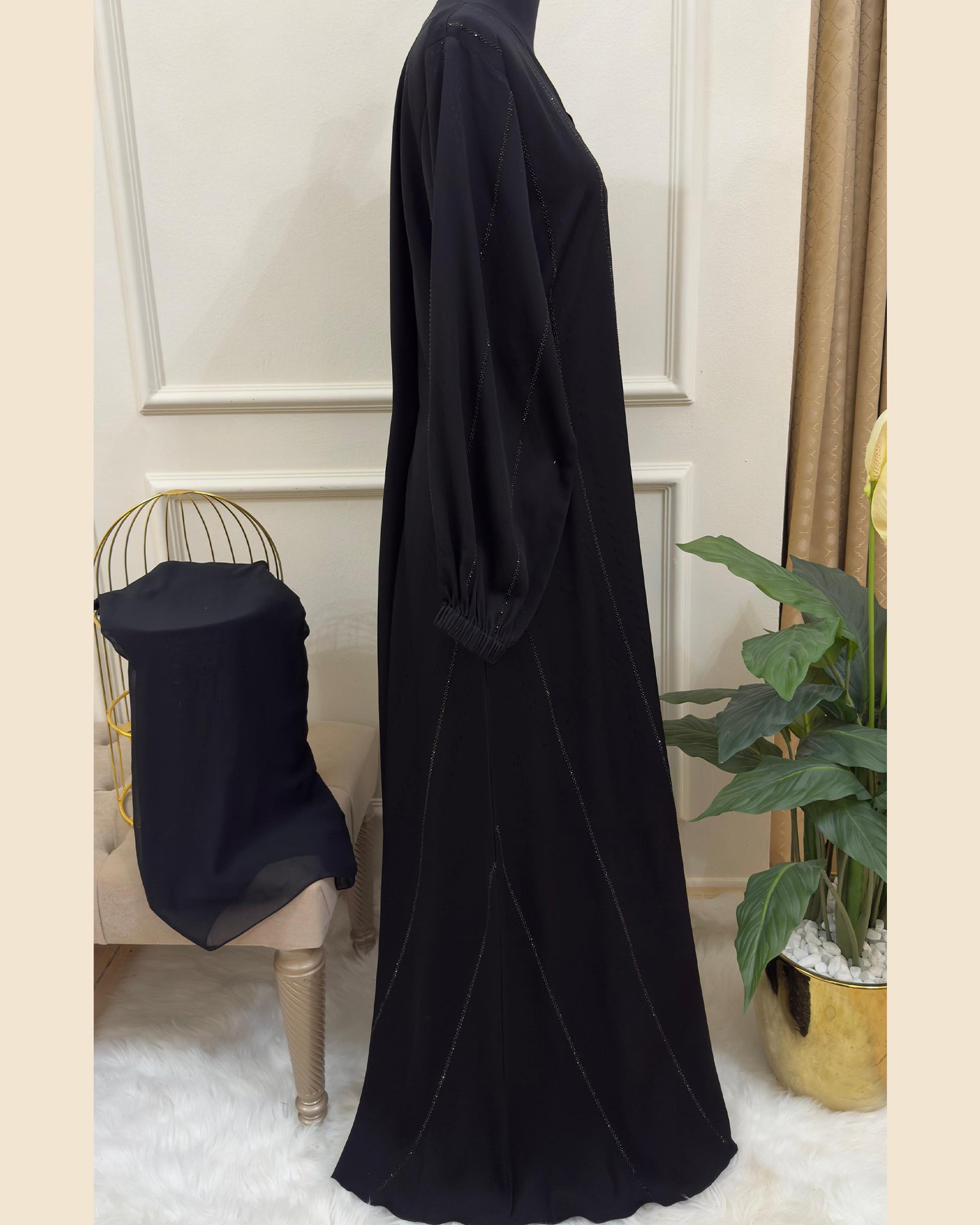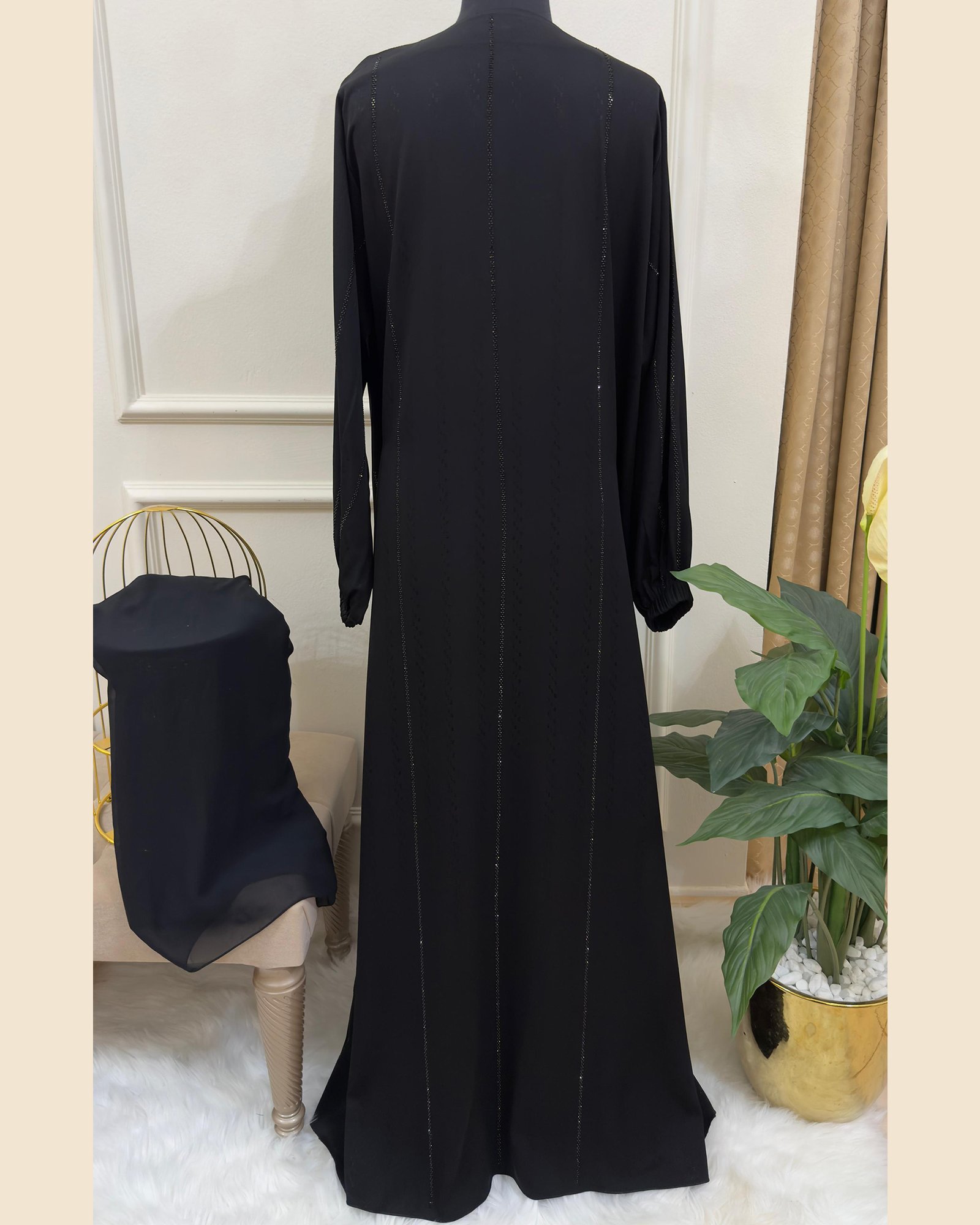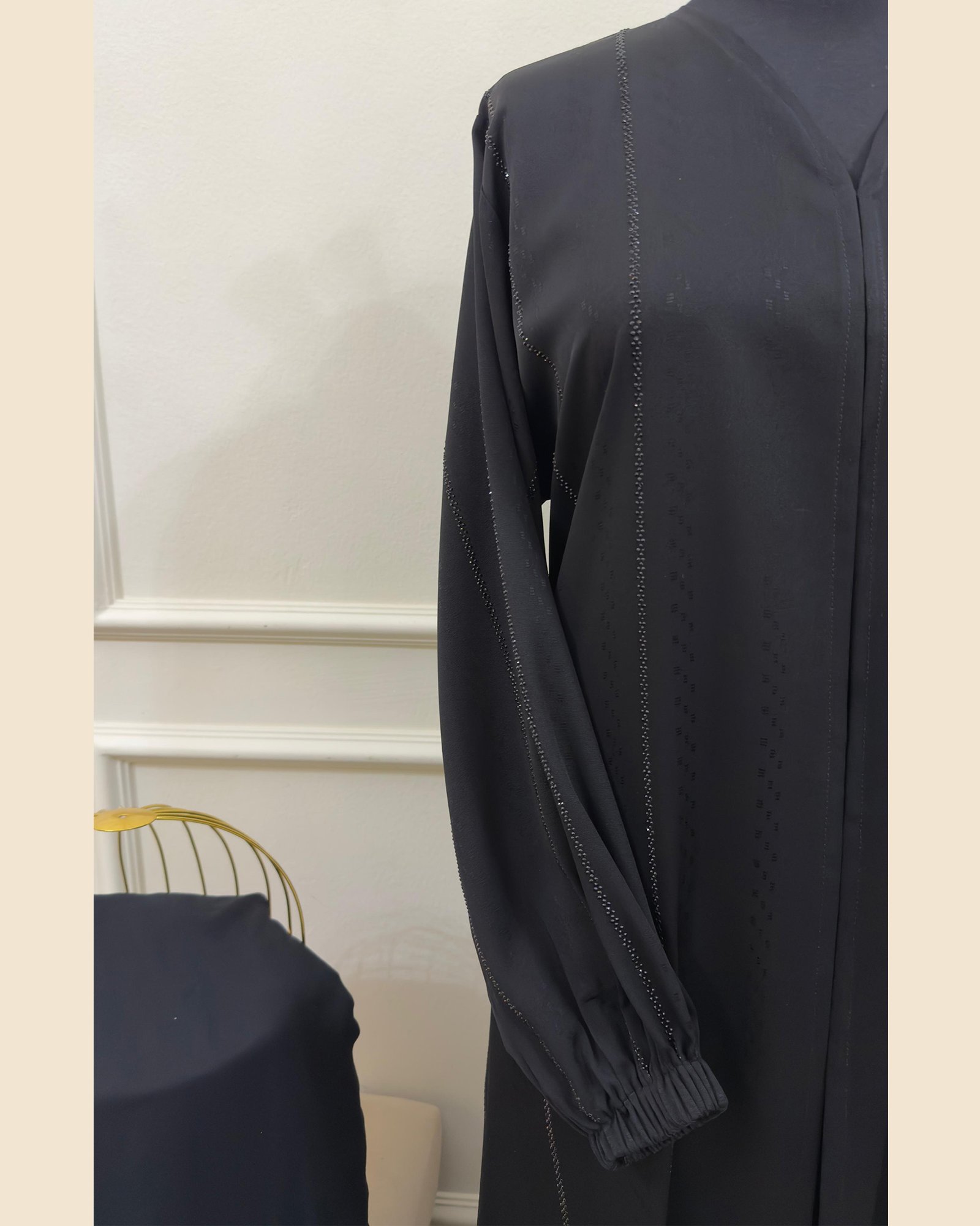 An exquisite black abaya designed with delicate vertical stone and thread embellishments, creating a refined silhouette that radiates subtle sophistication and graceful charm.