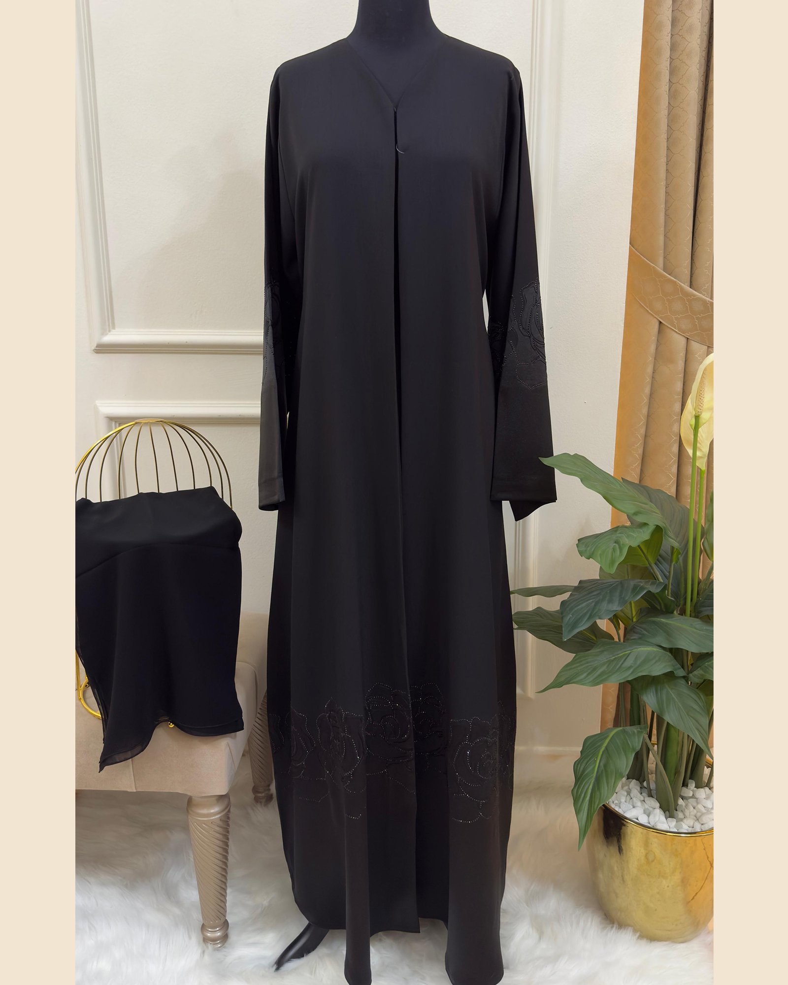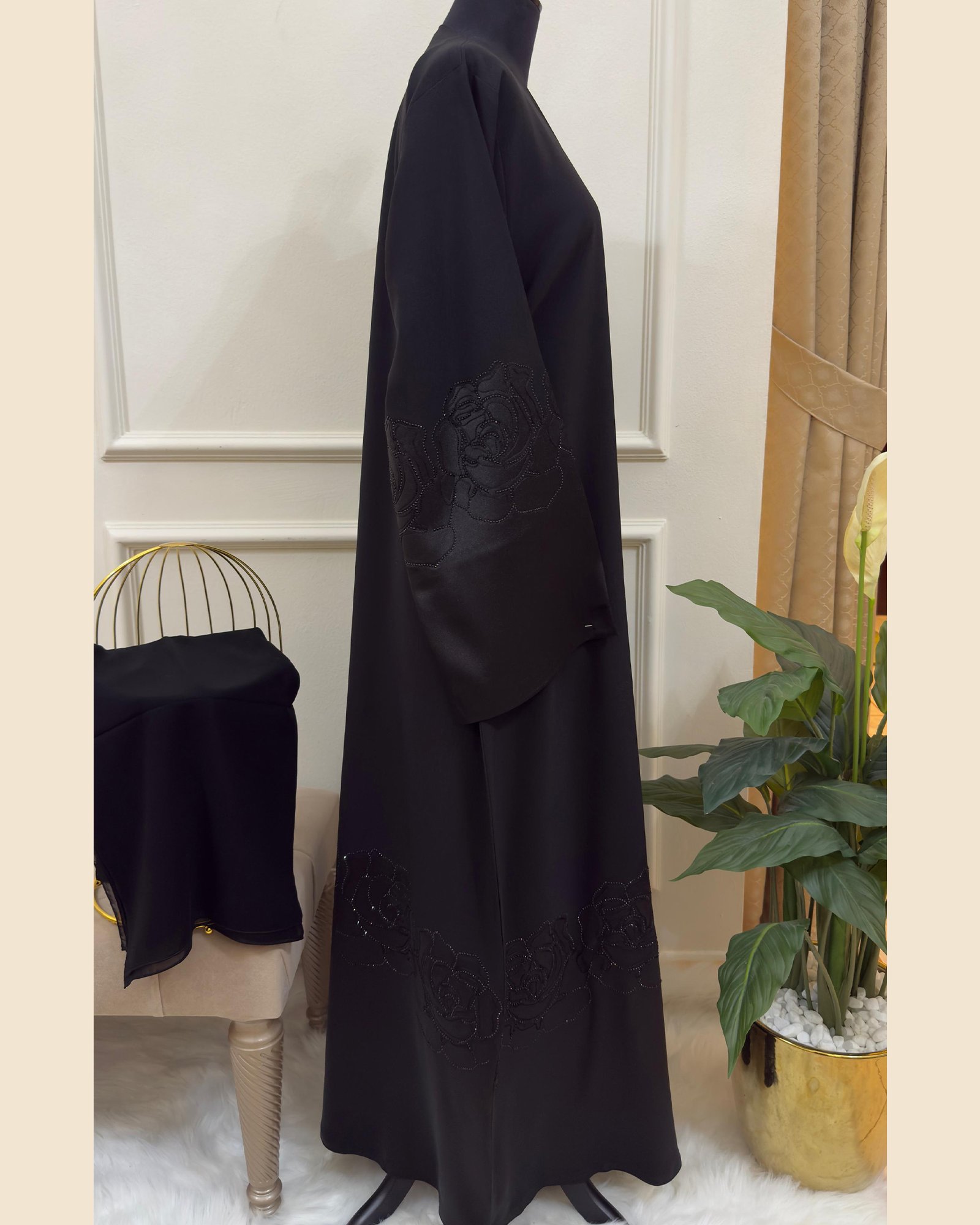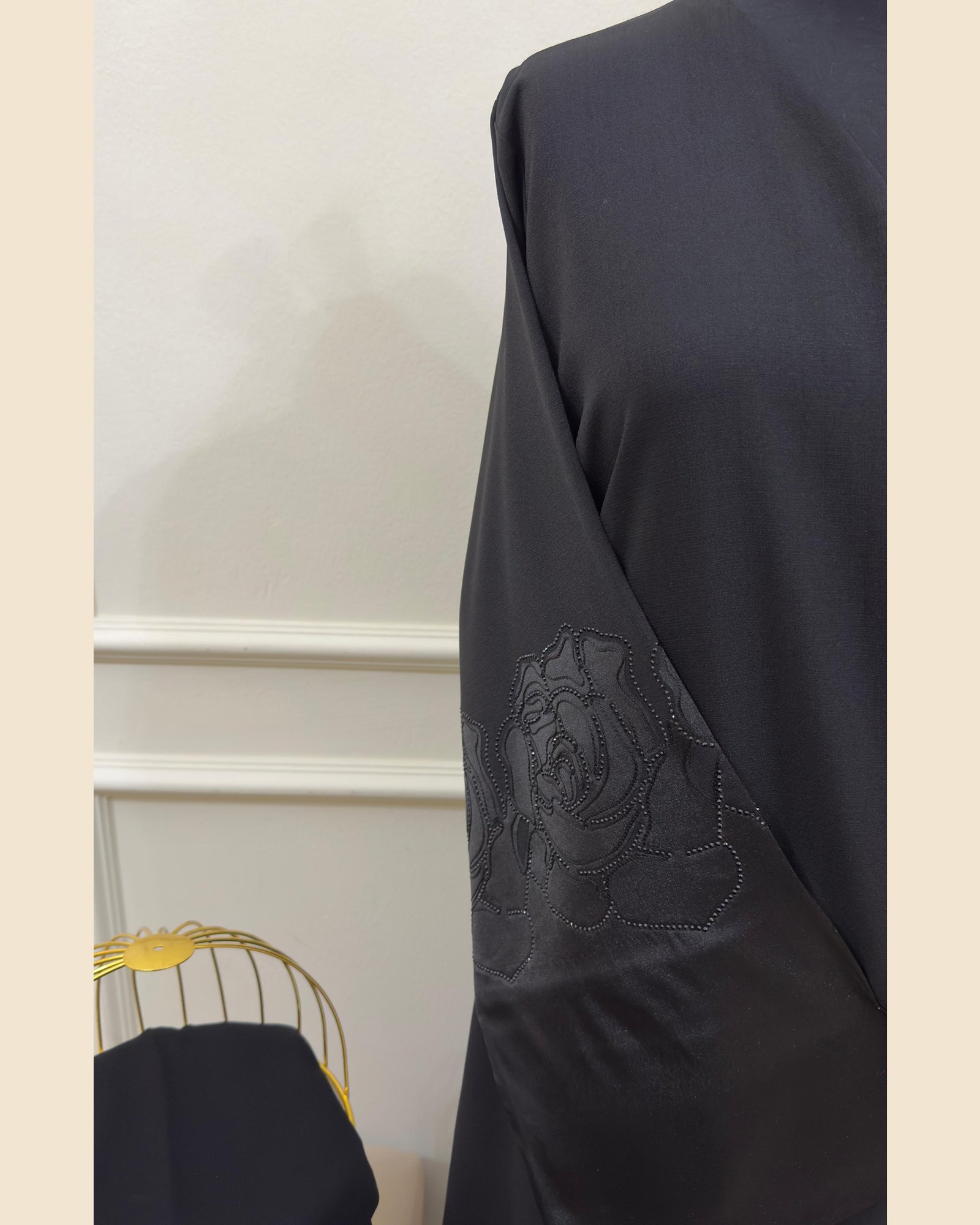 A timeless black Abaya Set that blends delicate craftsmanship with modern elegance —