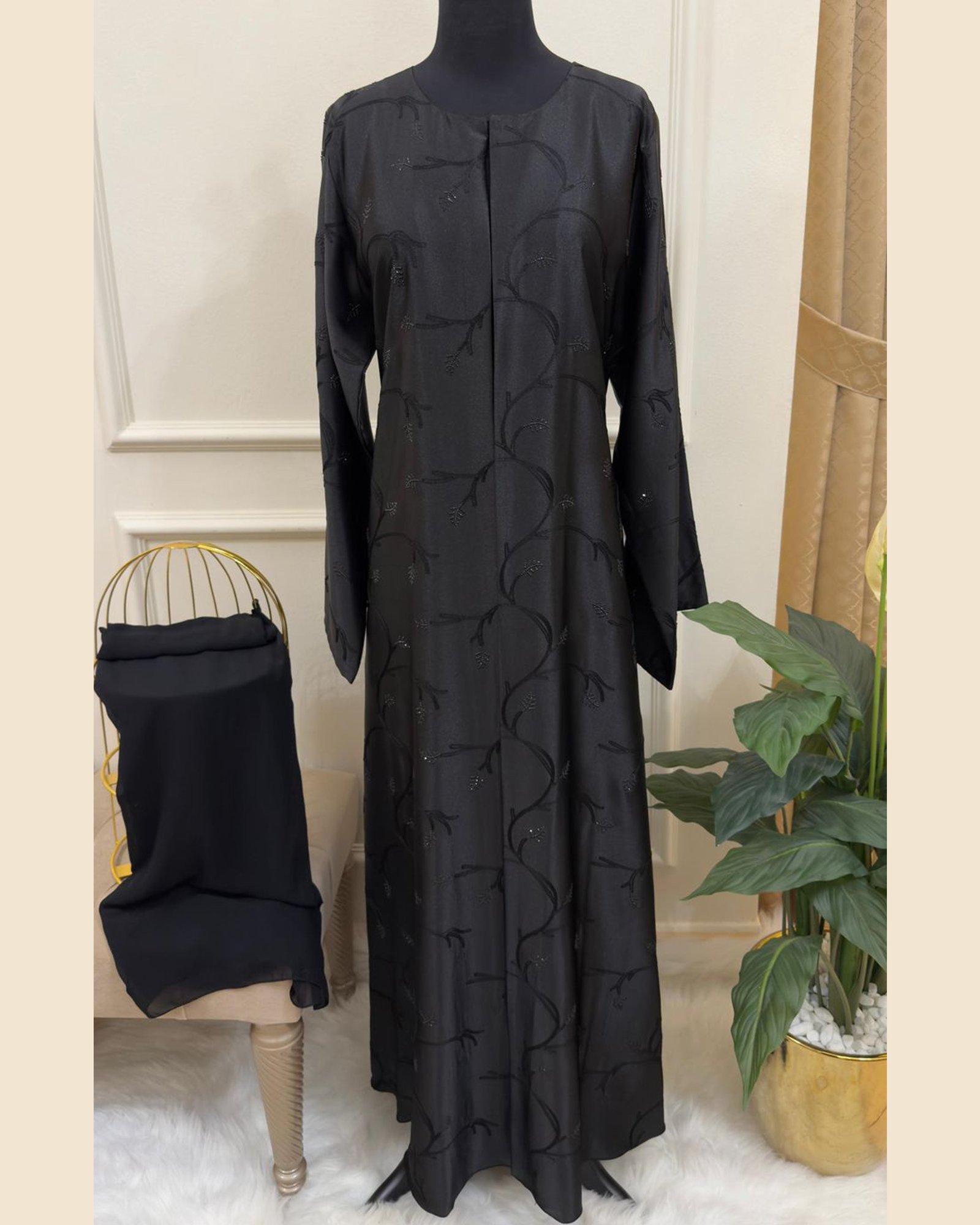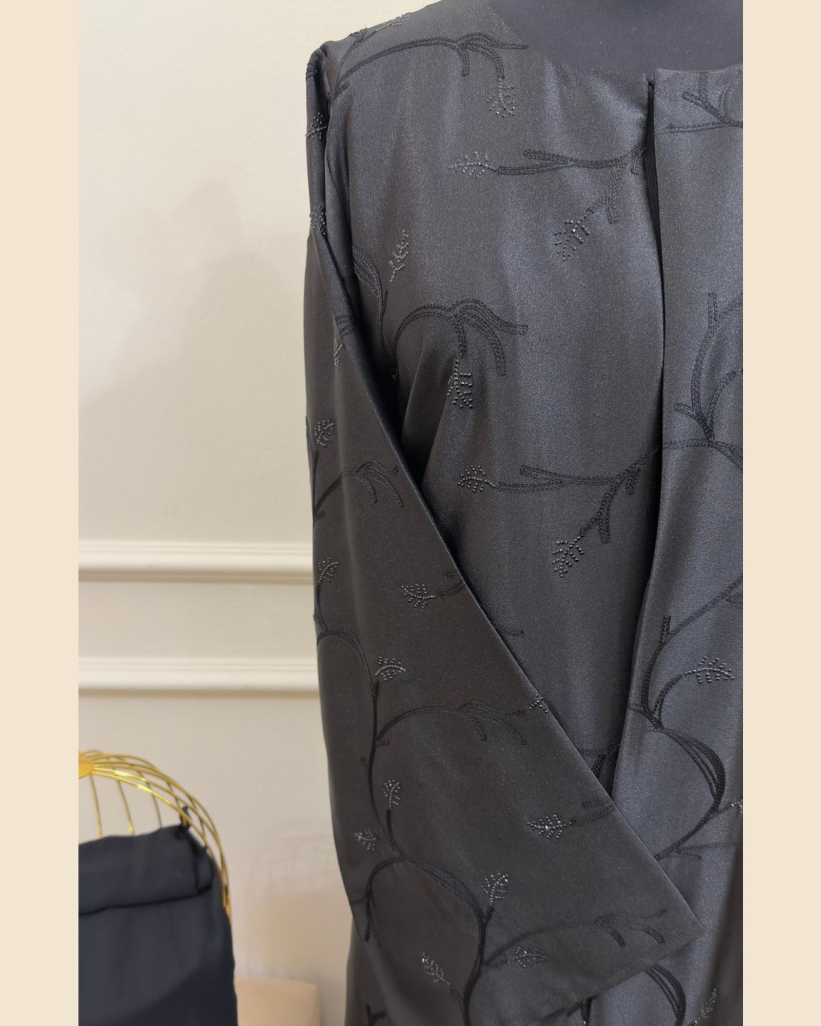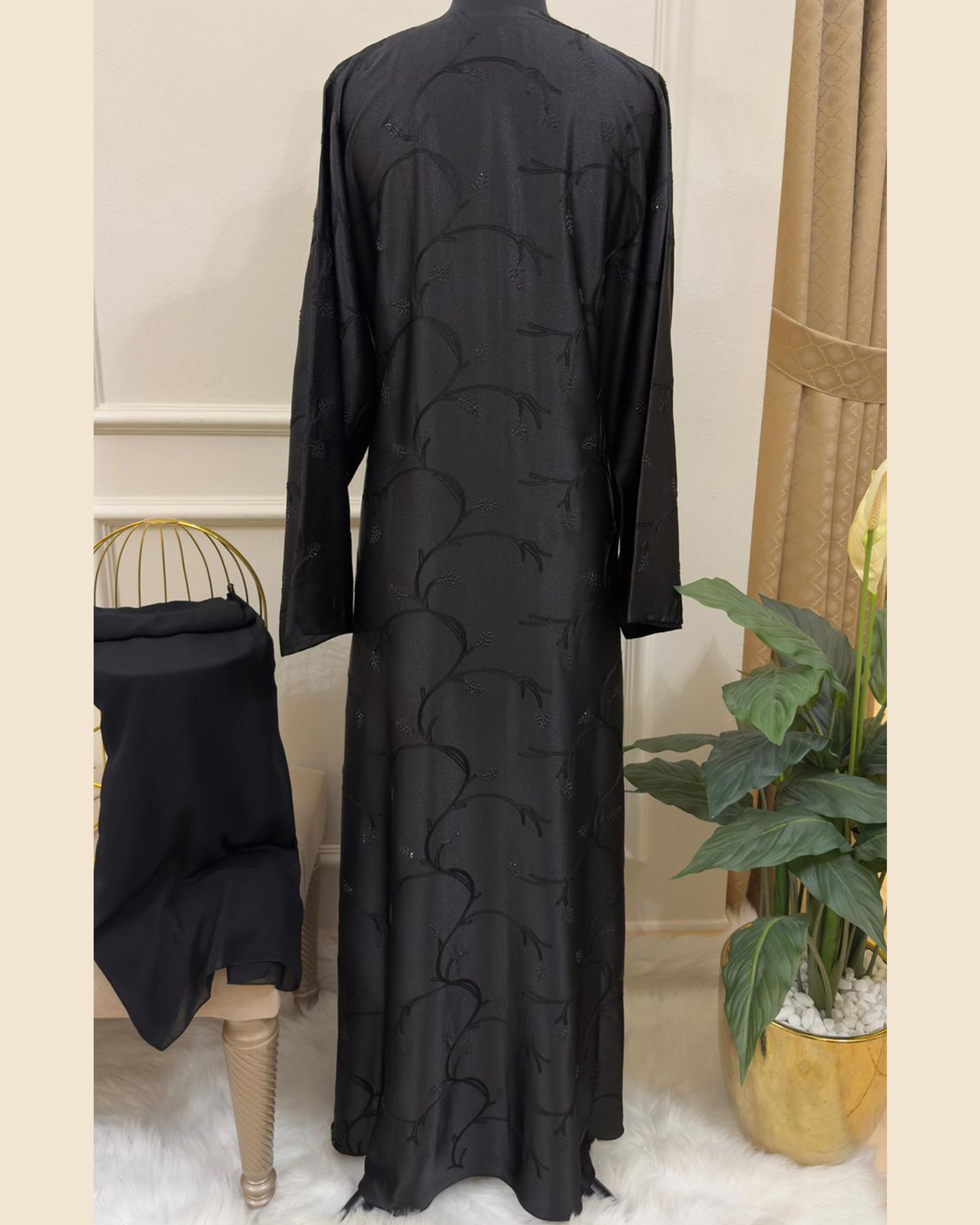 A refined black Abaya Set designed for Ramadan evenings, formal gatherings, special occasions, and elegant everyday wear — crafted to reflect timeless botanical beauty with modern sophistication.